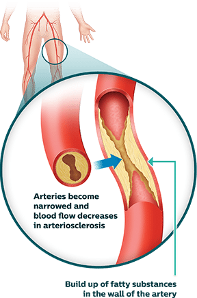 Peripheral artery disease (PAD) is a common condition in which fatty plaque builds up in the arteries. The plaque can harden and reduce the flow of blood to the head, organs, or limbs. Although PAD can occur in any blood vessel in the body, it typically affects the legs, ankles and feet. When blood flow is reduced, patients with PAD may experience uncomfortable symptoms such as leg pain while walking (claudication), reduced pulse, skin temperature changes and pain at rest.1 Over time, the progressive disease can reduce quality of life and mobility. Critical limb ischemia (CLI) is the advanced stage of PAD that may lead to non-healing wounds below the ankle, gangrene and ultimately limb amputation, as well as other serious health complications.2 Patients with PAD are also at risk for the development of stroke and heart attack.3 Learn more about the signs and symptoms of PAD.